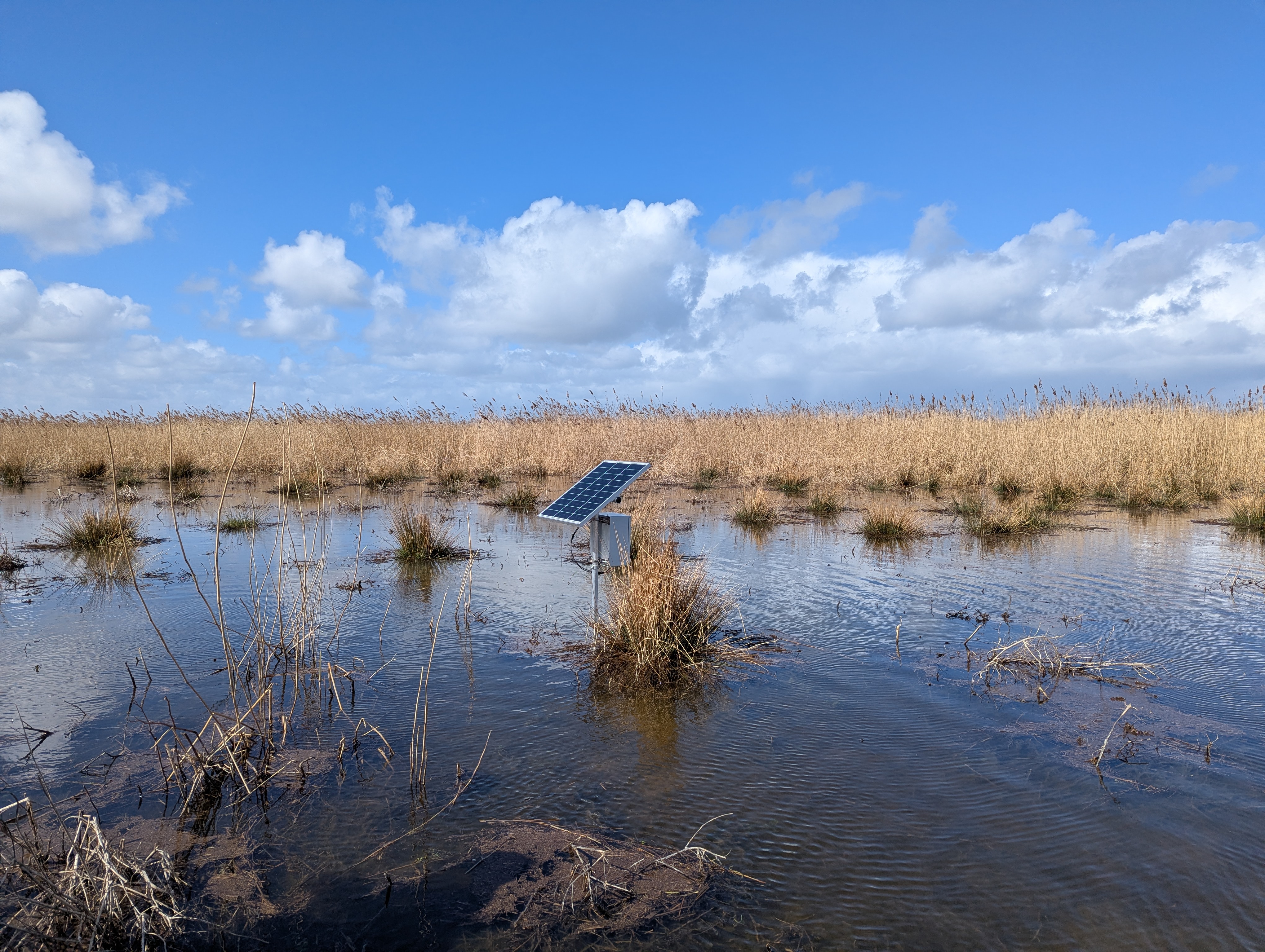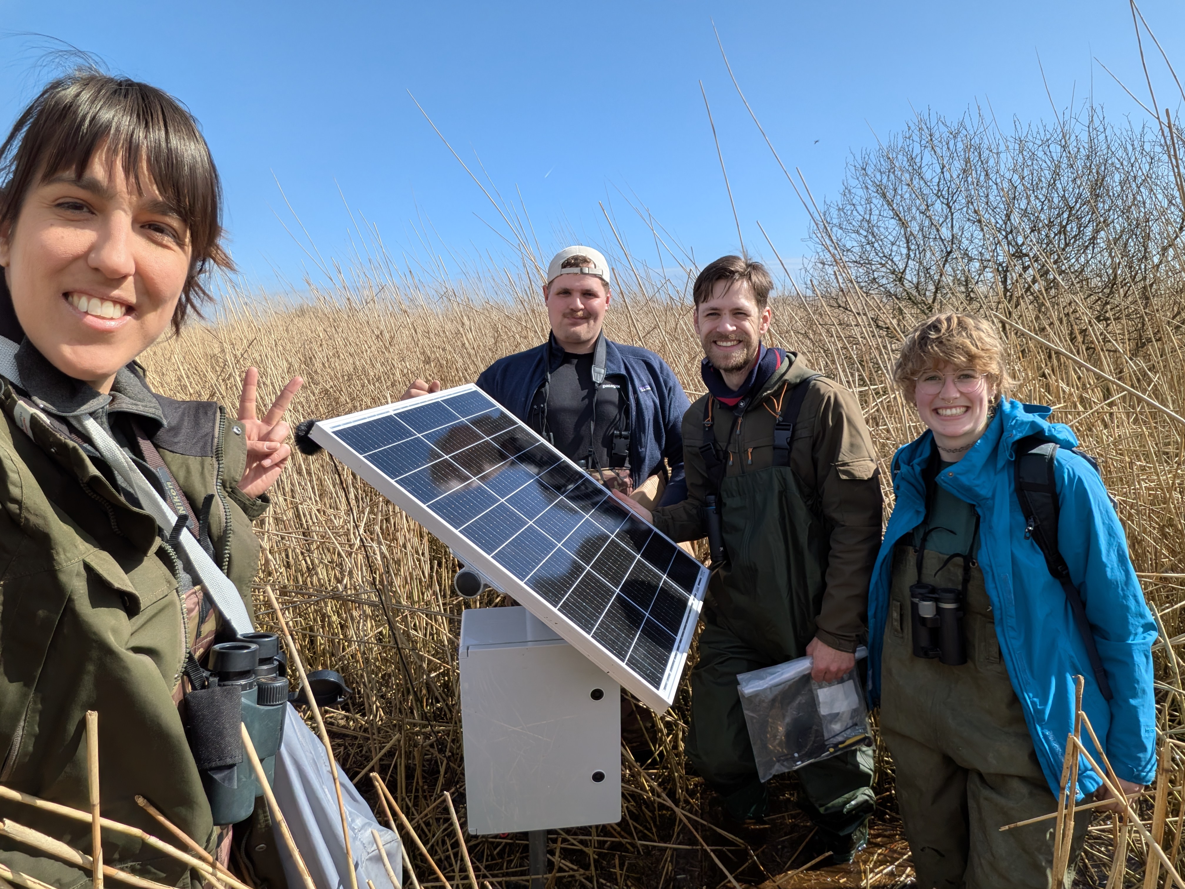 Donderdag 26 maart trokken we het moeras van de Oostvaardersplassen in om het eerste geluidsstation te plaatsen waarmee we op afstand de roepjes van porseleinhoen kunnen detecteren.