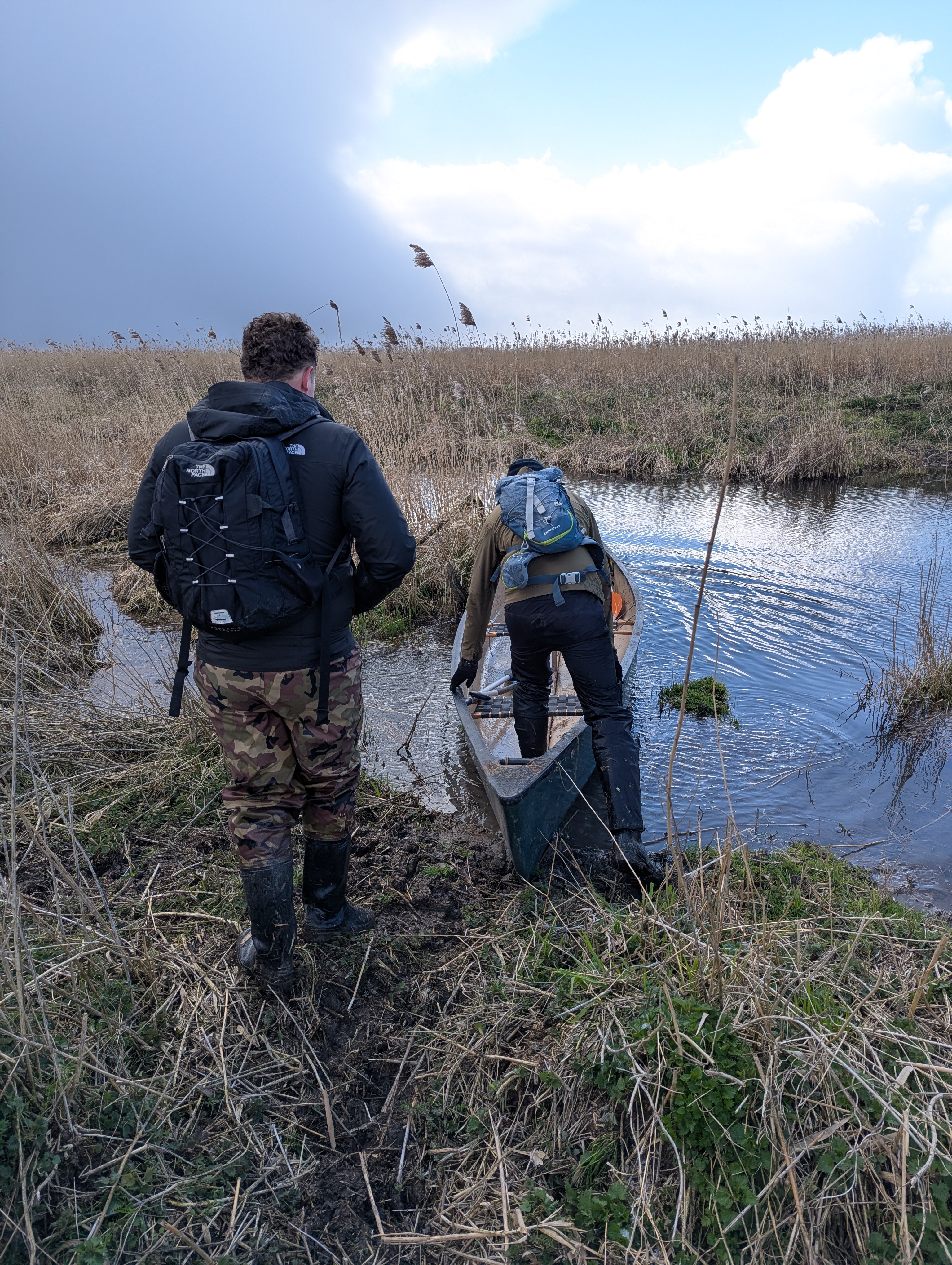 Het plaatsen van het eerste station was geen eenvoudige klus. De tocht begon door per kano enkele honderden meters het gebied in te trekken. Met flinke tegenwind was het een uitdaging om de uiteindelijke aanmeerplek te bereiken. Vanaf daar gingen we te voet verder door het moeras. Daarbij maakten we gebruik van de aanwezige paden van edelherten om door de dichte rietvegetatie te komen.